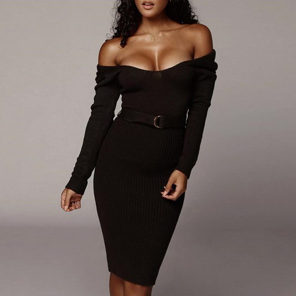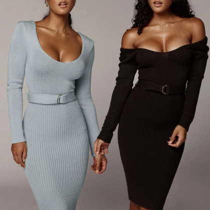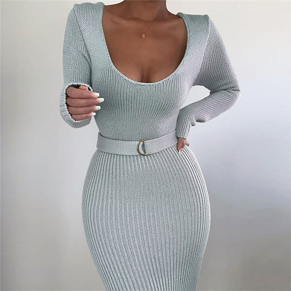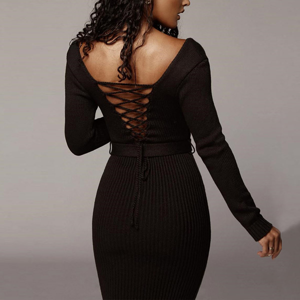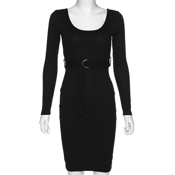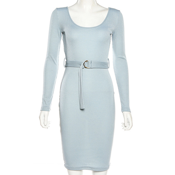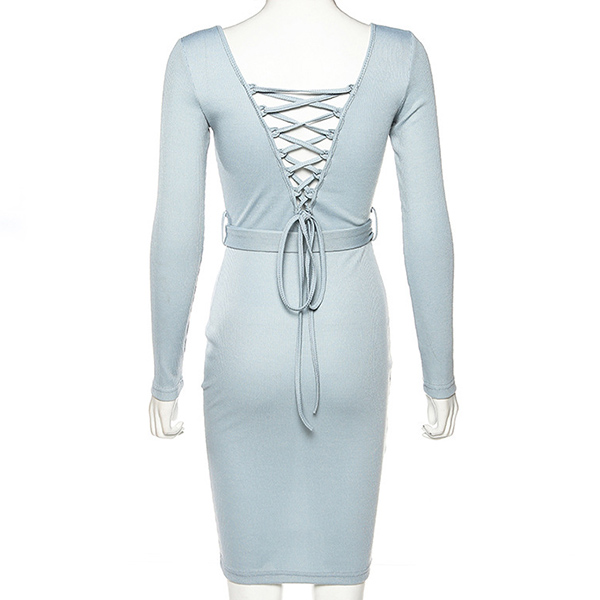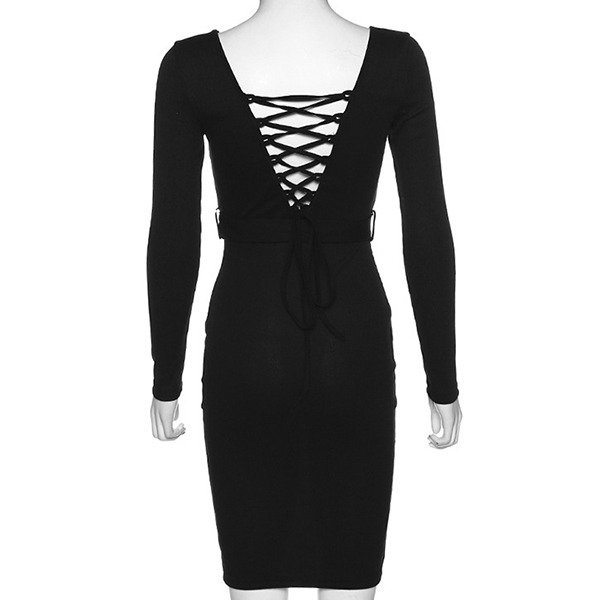Sexy Backless Long Sleeve Round Neck Slim Fit Dress with Waistband