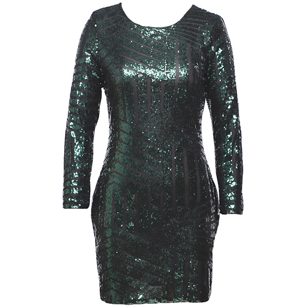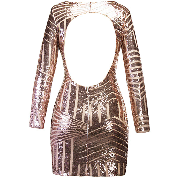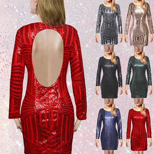Sexy Backless Long Sleeve Round Neck Slim Fit Sequin Party Dress