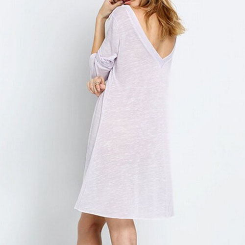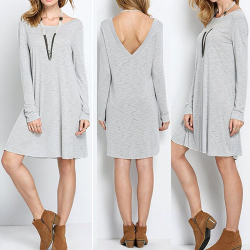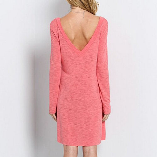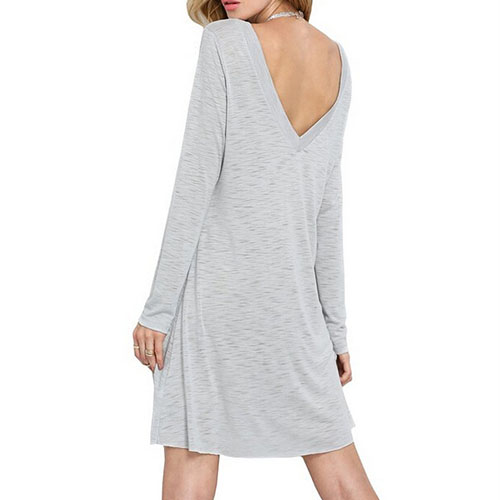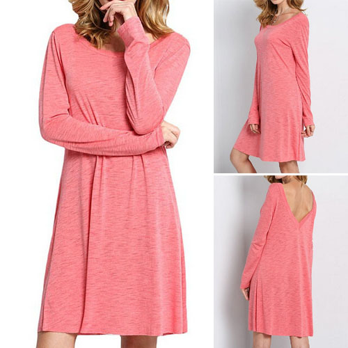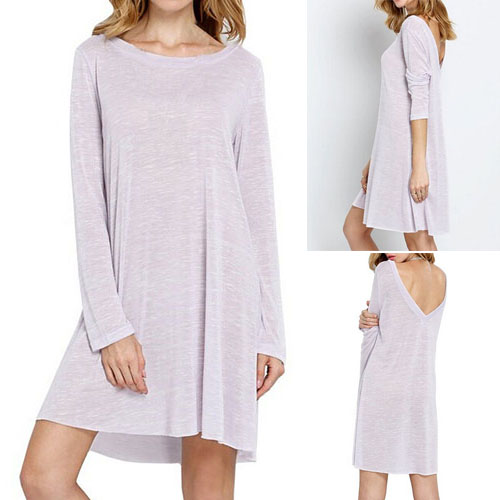 Sexy Backless Long Sleeve Round Neck Solid Color Dress