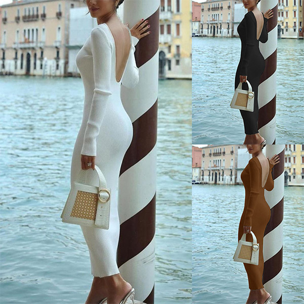 Sexy Backless Long Sleeve Round Neck Solid Color Slim Fit Dress