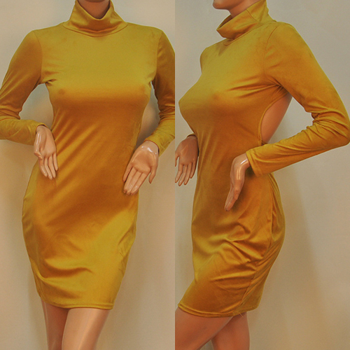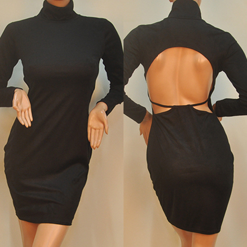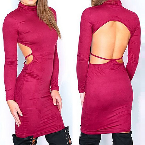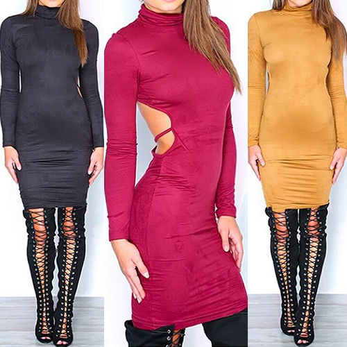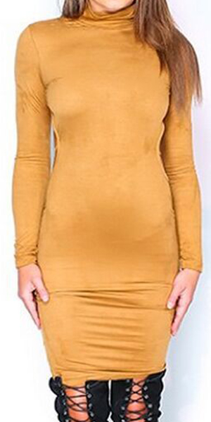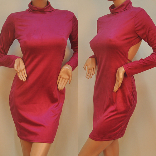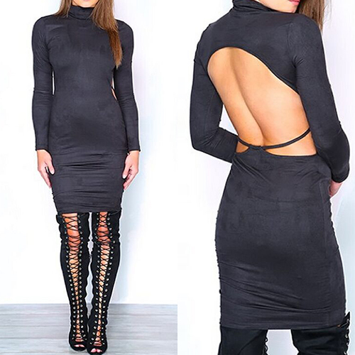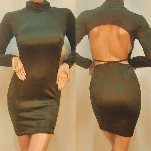 Sexy Backless Long Sleeve Turtleneck Faux Suede Sheath Dress
