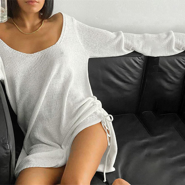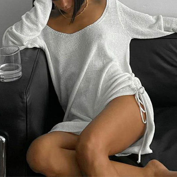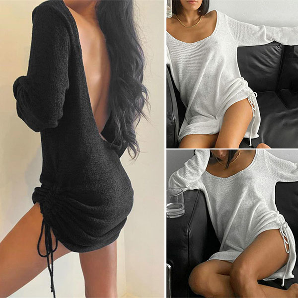You can easily arouse a splash when you dress yourself up with this smock. Solid color style,the backless and U-neck design make this piece look so sexy and alluring,while the side-drawstring design will further enhance its charm.
