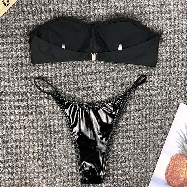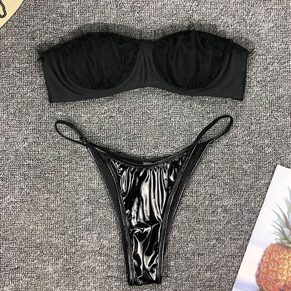 Summer time is a good chance for you to head to the seaside to enjoy the sunbathing and relax yourself. So how could you miss this sexy bikini set? Coming with a gauze spliced bandeau bikini top and a PU leather bikini bottom,this bikini set is sure to expose your charming skin and seductive curve.