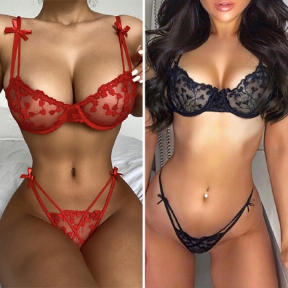 Sexy Backless Low-waist See-through Lace Embroidered Flowers Lingerie Set