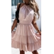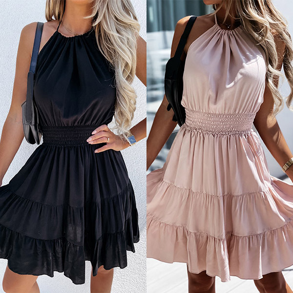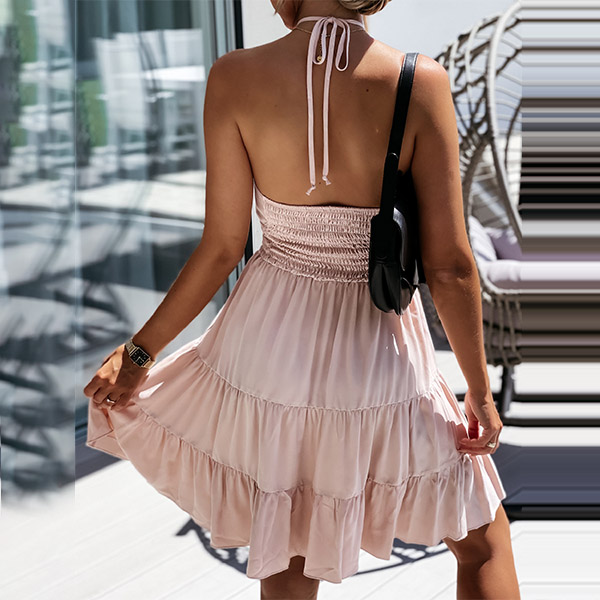 To greet the sun-soaked summer days,this dreamy and relaxed halter dress would be your perfect choice. The high waist with elastic design can better gather your waistline,while the backless,off-shoulder and ruffle hem design will lend you some sweet yet feminine appeal. Just slip into this dress to enjoy your wonderful days!