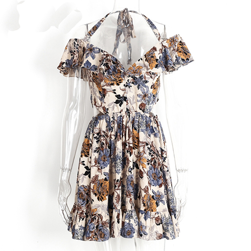 Sexy Backless Off-shoulder Lotus Sleeve Printed Dress