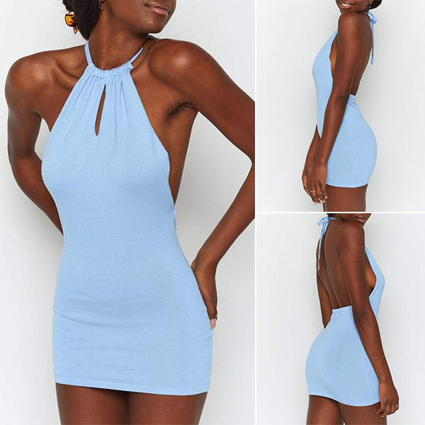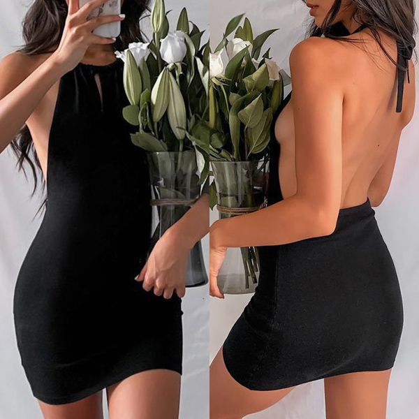 Sexy Backless Off-shoulder Solid Color Slim Fit Halter Mini Dress