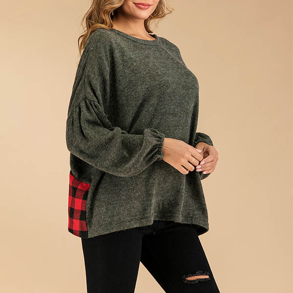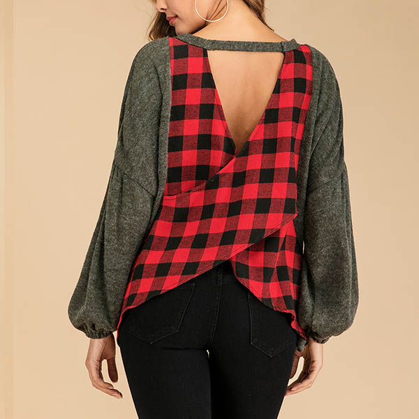 Sexy Backless Plaid Spliced Long Sleeve Loose Knit Top