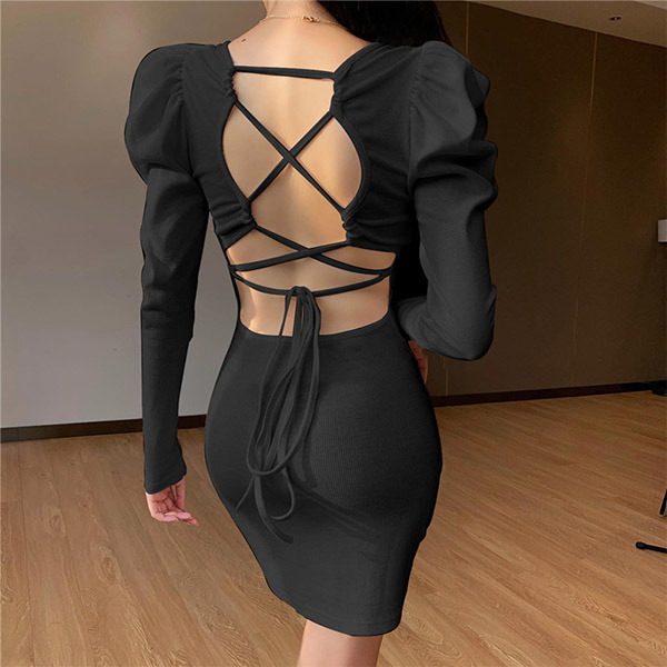 Sexy Backless Puff Sleeve Round Neck Slim Fit Dress