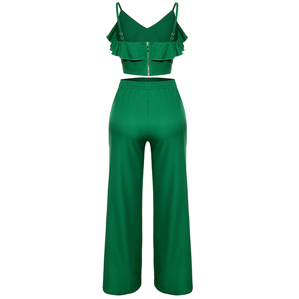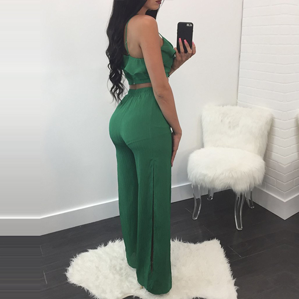 Solid color style,including a backless ruffle cami top and a high waist slit hem wide-leg pants,this two-piece set can