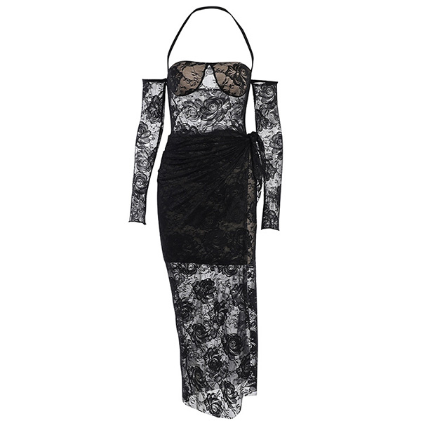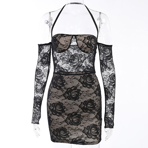 Sexy Backless See-through Lace Spliced Slim Fit Halter Dress