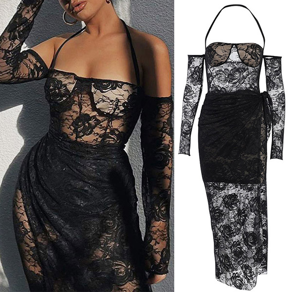 Wanna shine at your next event but don't wanna take too much energy? Then you can turn to this dress for help. Halter style,the fit silhouette design can showcase your slender figure,while the see-through lace details can offer you a more alluring look. You can easily be the focus in this little stunner .
