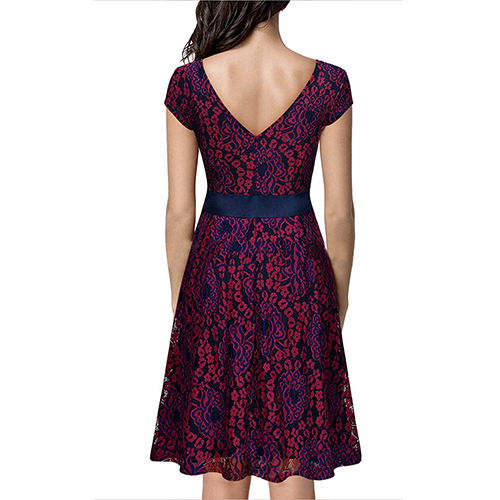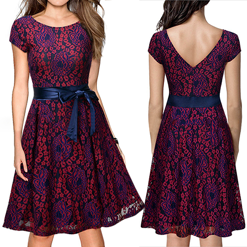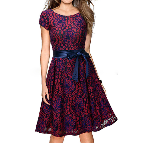 charming lace dress! Tailored with short sleeve,round neck and gathered waist design,this delicate dress can make you look elegant at any occasions.