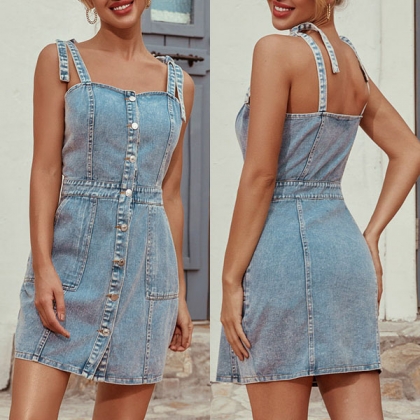 Create a sassy and flirty look with the help of this denim dress.Sling style,with backless,single-breasted and a fit silhouette,this dress not only can showcase your slender figure,but also can exude your charming feminine appeal and alluring vibes. When you go out with this dress,you can easily win more eyes.