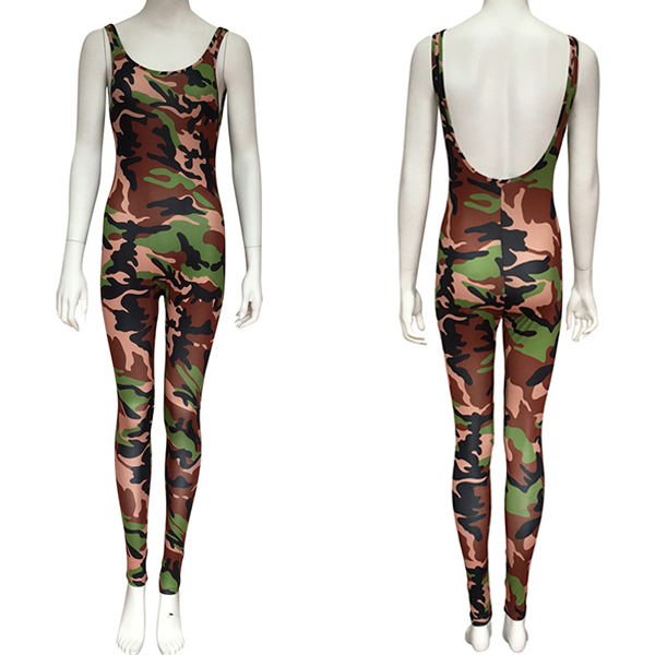 Camouflage printed style,designed with sleeveless,round neck,backless and a super fit silhouette,this jumpsuit is