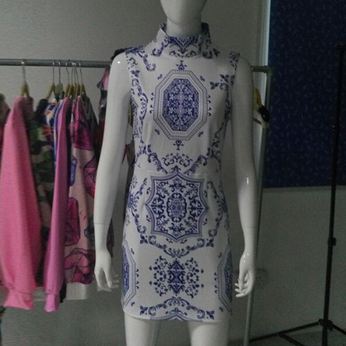This cheongsam dress features retro style Blue and White Porcelain printed pattern,with turtleneck