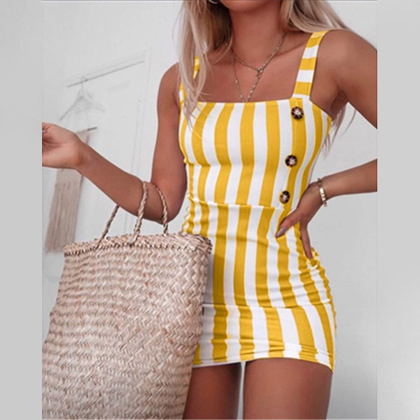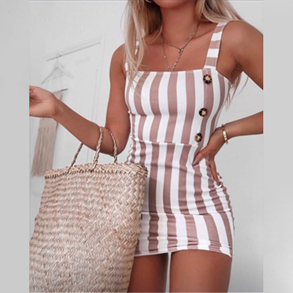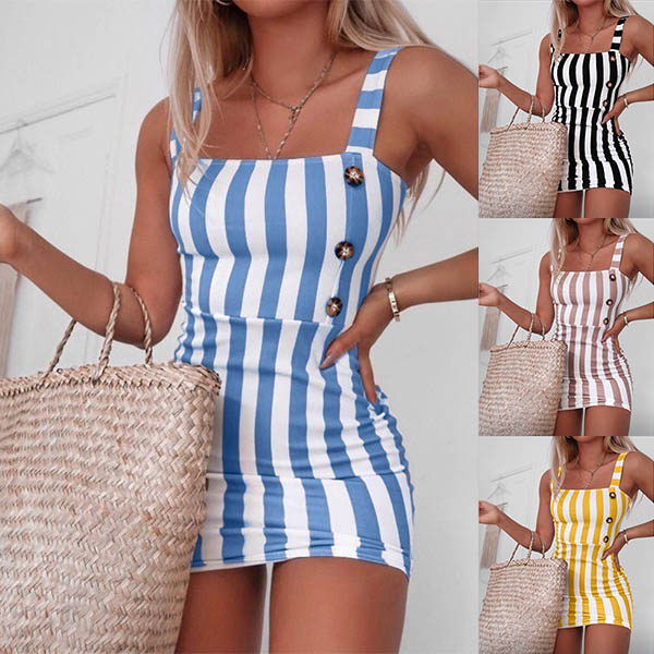Boost your beautiful charms with the help of this dress. Sling style,with backless,front-button details and a fit silhouette,this striped dress not only can showcase your slender figure,but also can offer you an alluring look. So why not slip into this piece to flaunt off yourself?