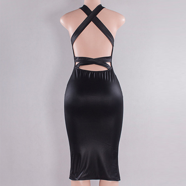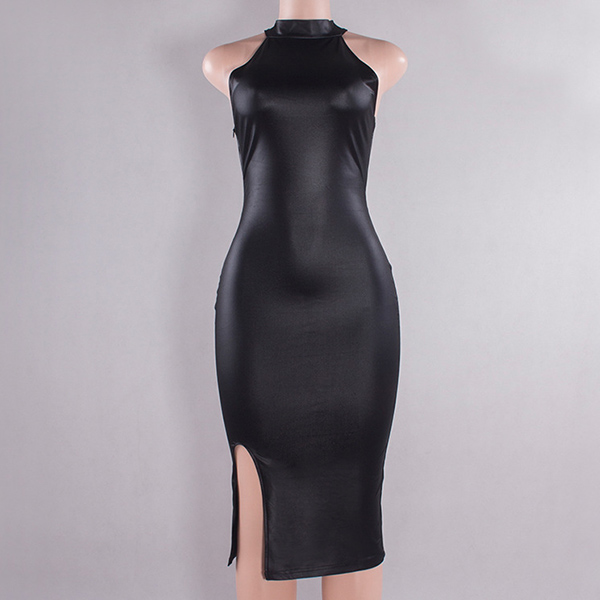 Sexy Backless Slit Hem Slim Fit PU Leather Dress