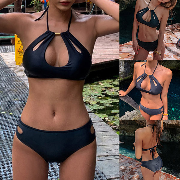 When walking on the beach with this bikini set,you can easily gain more eyes. Solid color style,including a halter bikini top and a low-waist bikini bottom,designed with hollow out and metal ring details,sexy,distinctive yet alluring. You can trust them to give you a happy and memorable beach time.