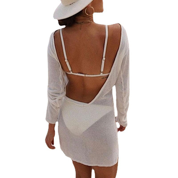 Sexy Backless Solid Color Long Sleeve Slim it Knit Beach Dress