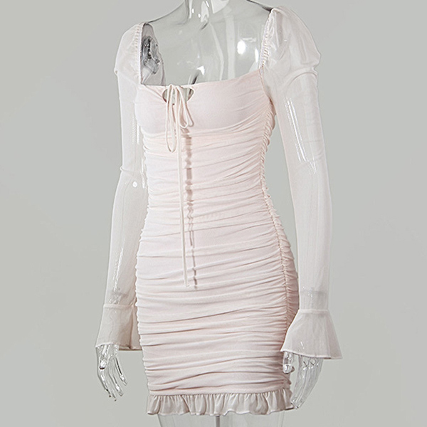 You are sure to draw more attention when you dress yourself up with this dress. Its alluring design details like backless,square collar and see-through gauze spliced long sleeve design can make you full of flirty and seductive sense,while the ruffle hem design will add some playful vibes. Save this little stunner for your cocktail parties.