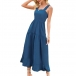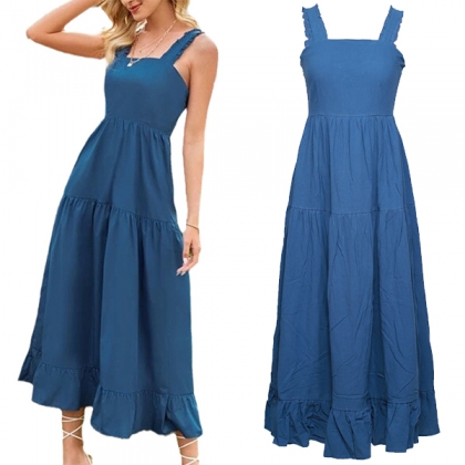 Sexy Backless Square Collar High Waist Solid Color Ruffle Hem Sling Dress