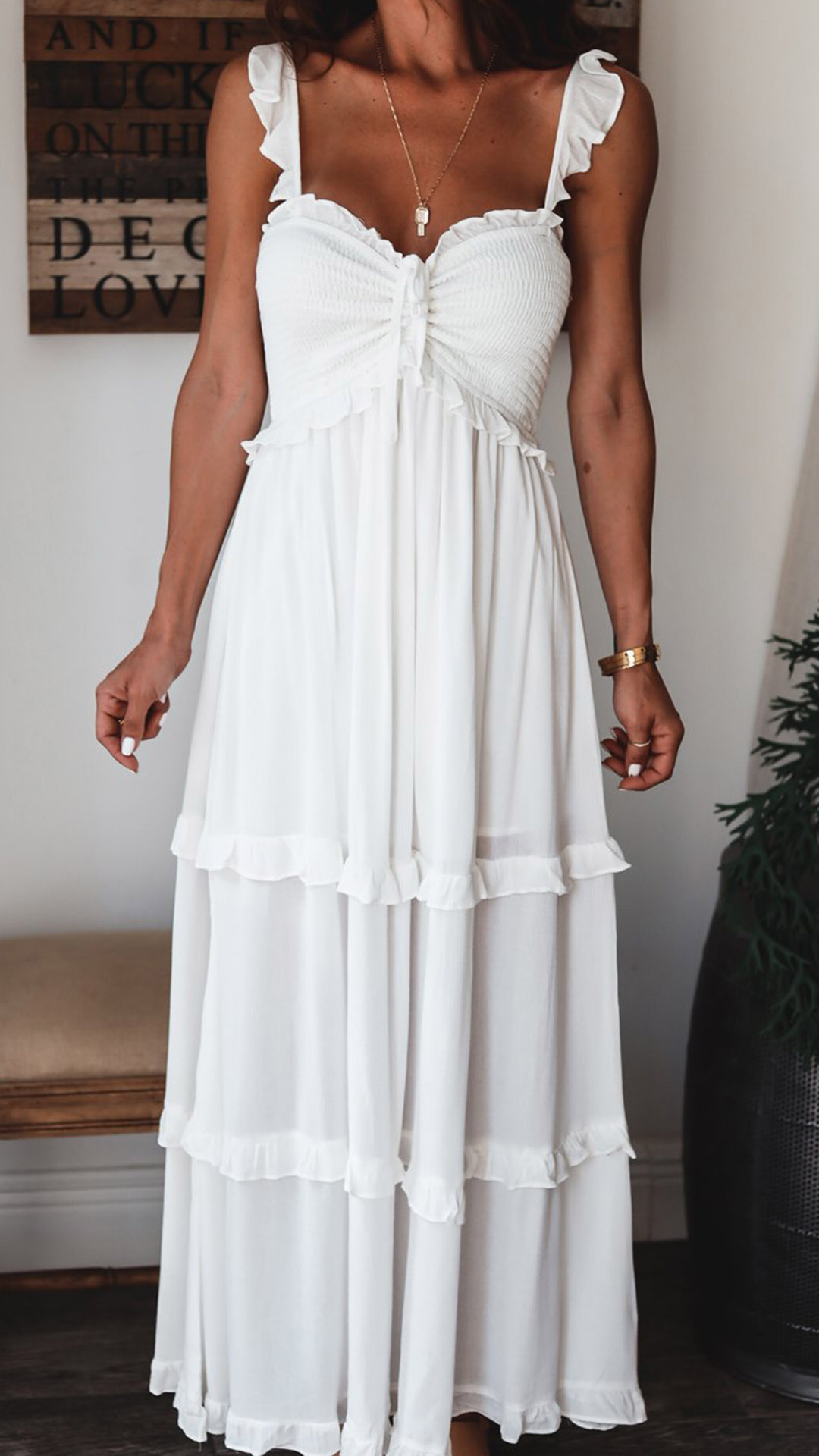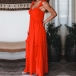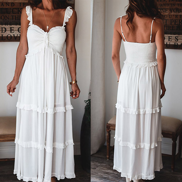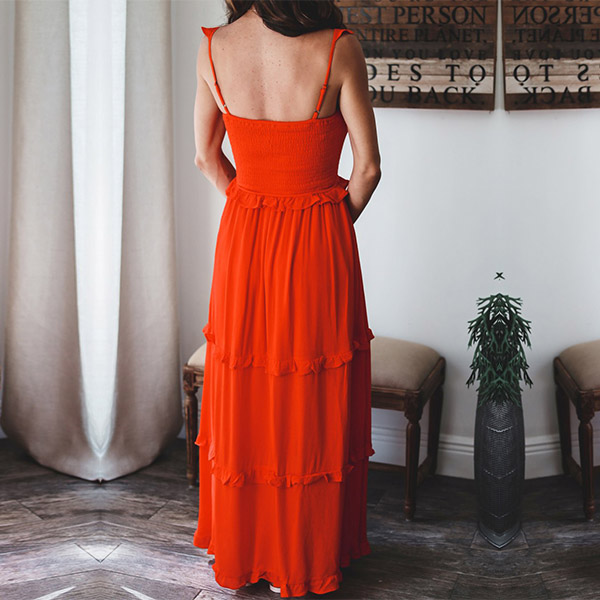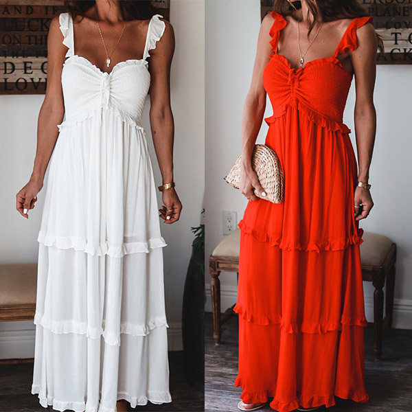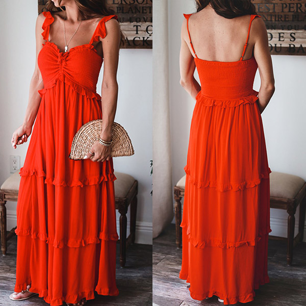When walking on the beach with this maxi dress,you can easily be a pleasant sight to draw more attention. Sling style,with backless,Square Collar and ruffle details,this piece knows how to exude your sexy,flirty and feminine side. On these sunny days,adding a sweet straw hat would be more perfect. So why not add this piece to your summer wardrobe ensemble?