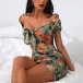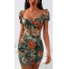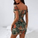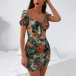 Sexy Backless Square Collar Puff Sleeve Slim Fit Printed Dress