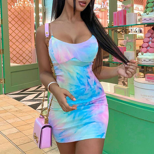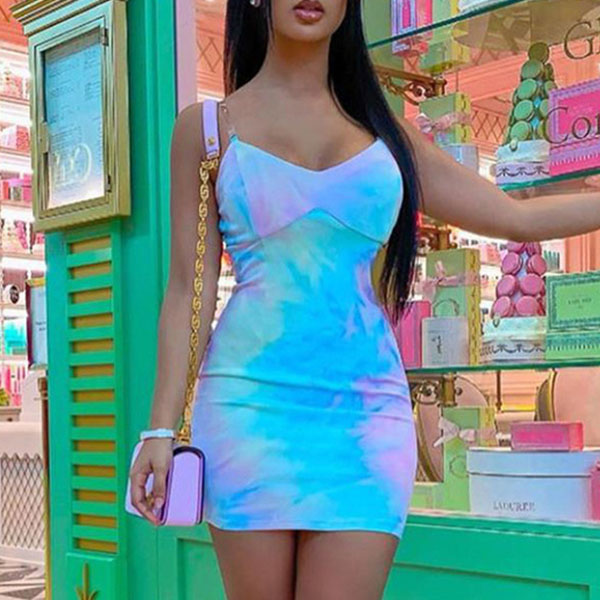 Catch the envious eye of everyone in the room with this stunning dress. Sling style,with backless and a fit silhouette,this dress can showcase your perfect curve. The tie-dye printed details make this piece look more eye-catching. So why not slip into this piece to express your beauty and charm.