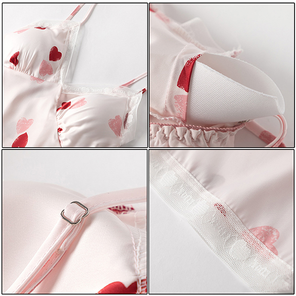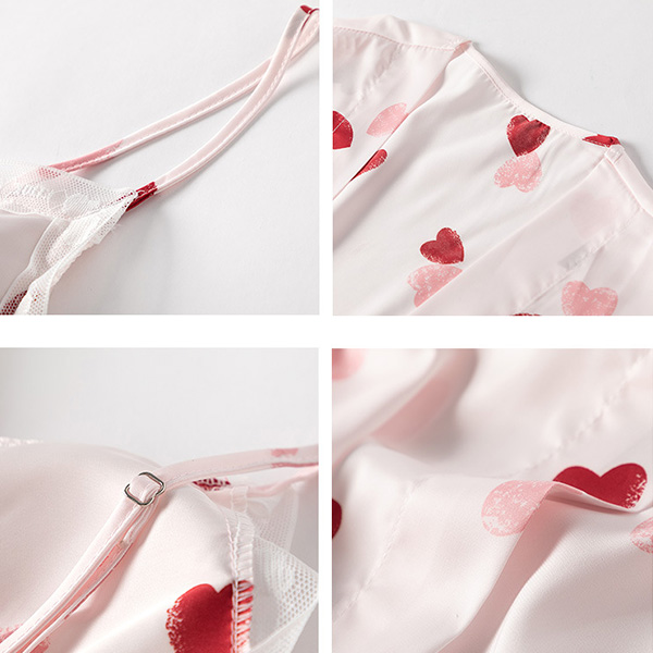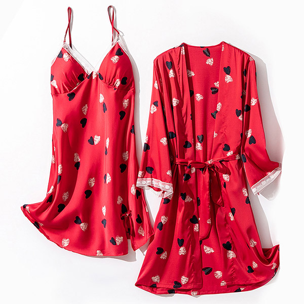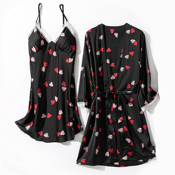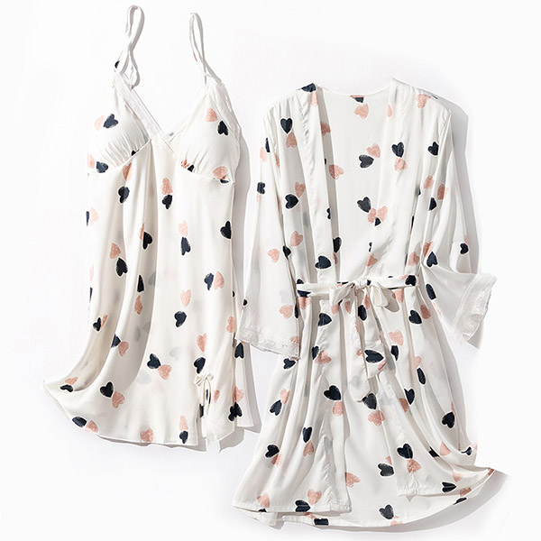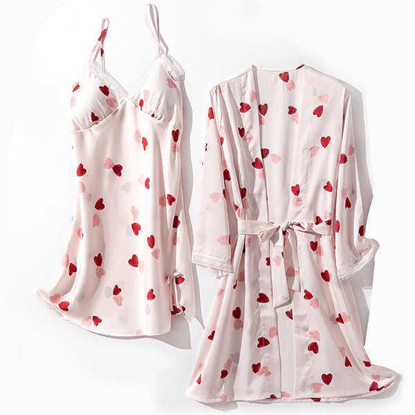 Sexy Backless V-neck Heart Printed Sling Nightwear Dress + Robe Two-piece Set