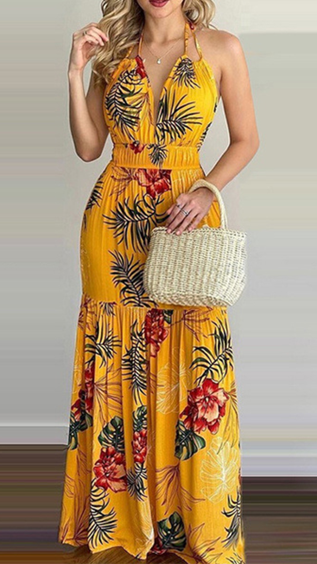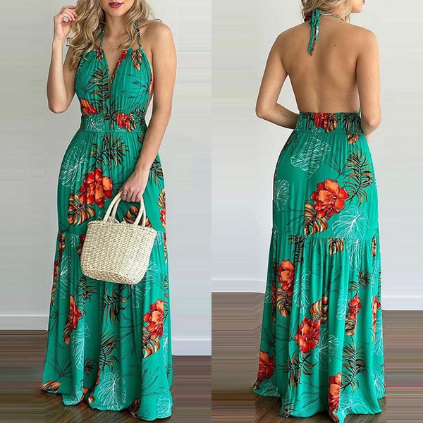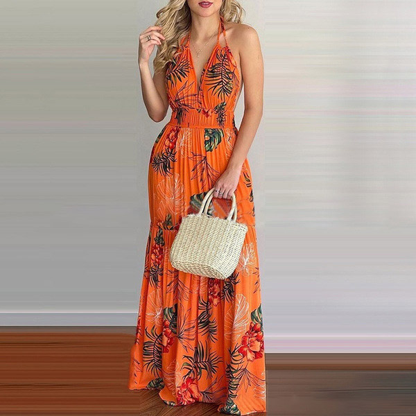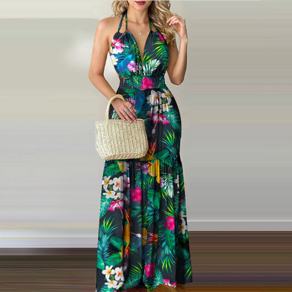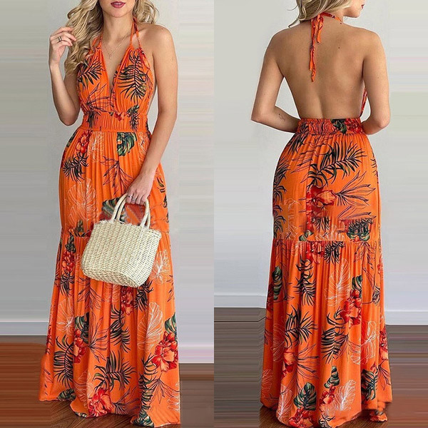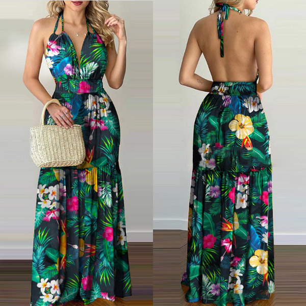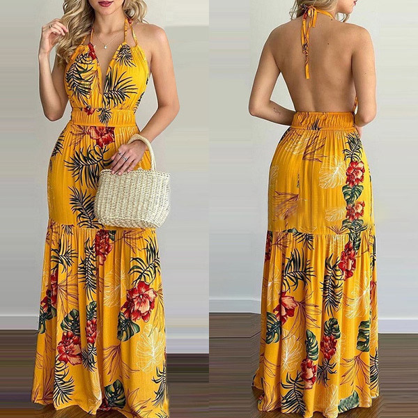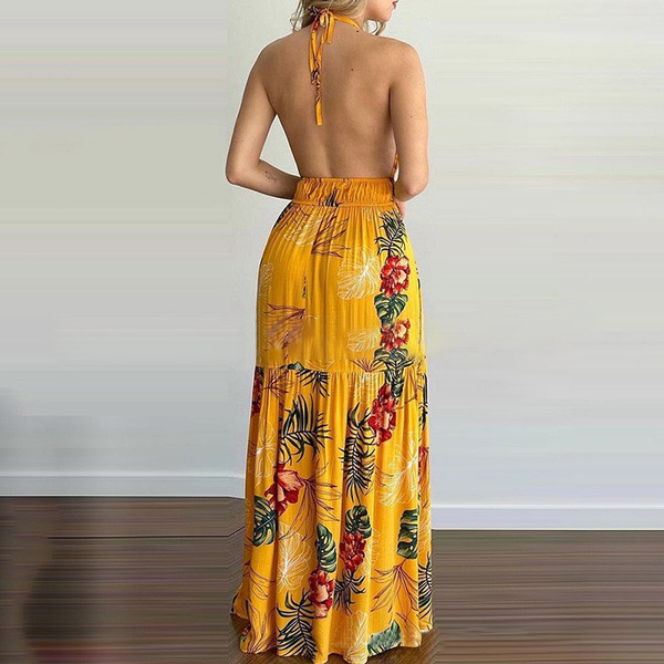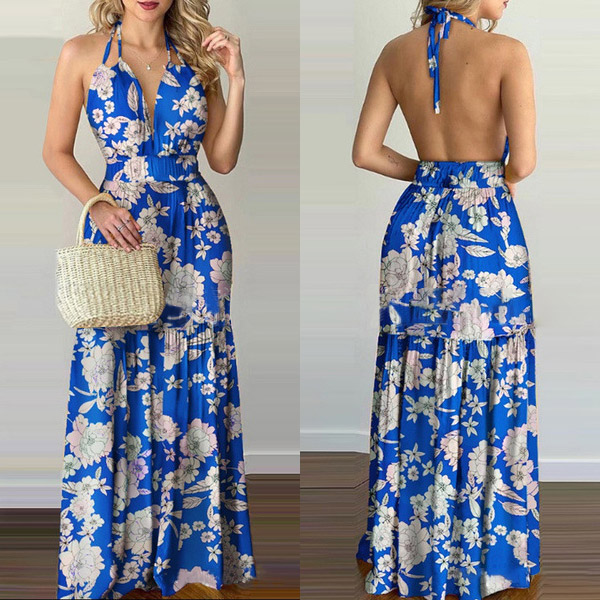 This printed dress makes it easy for any girl to look effortlessly charming and beautiful. Halter style,with backless and v-neck design,this dress can offer you an alluring look. It is designed with vibrant floral print details,with high waist and maxi length,this dress is perfect fit for your summer days like beach time and tropical getaways.
