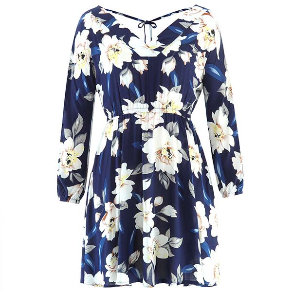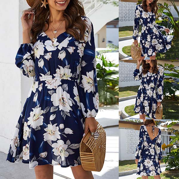 Sexy Backless V-neck High Waist Long Sleeve Printed Dress