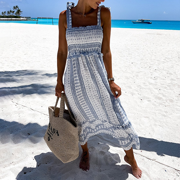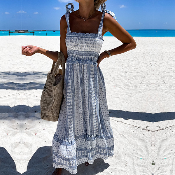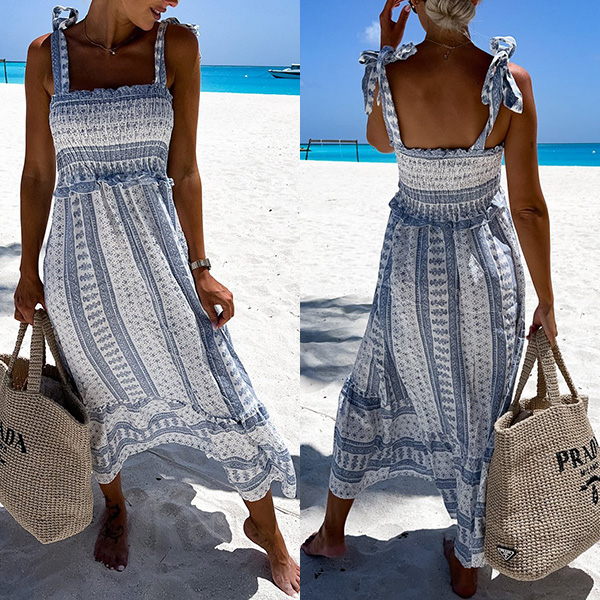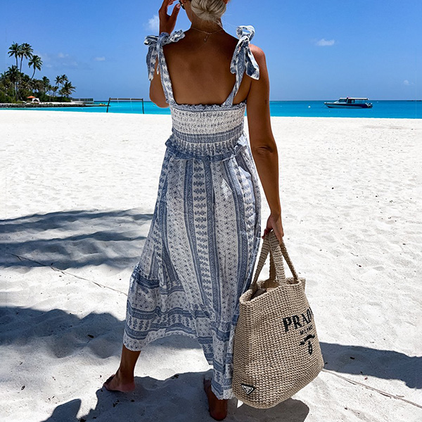Splash on some sensational sizzle when you slip into this stunning dress. Halter style,with backless,v-neck and high waist design,this printed dress not only can make you look alluring,but also can showcase your slender figure. For some fancy events,this beautiful dress can be your wise choice.