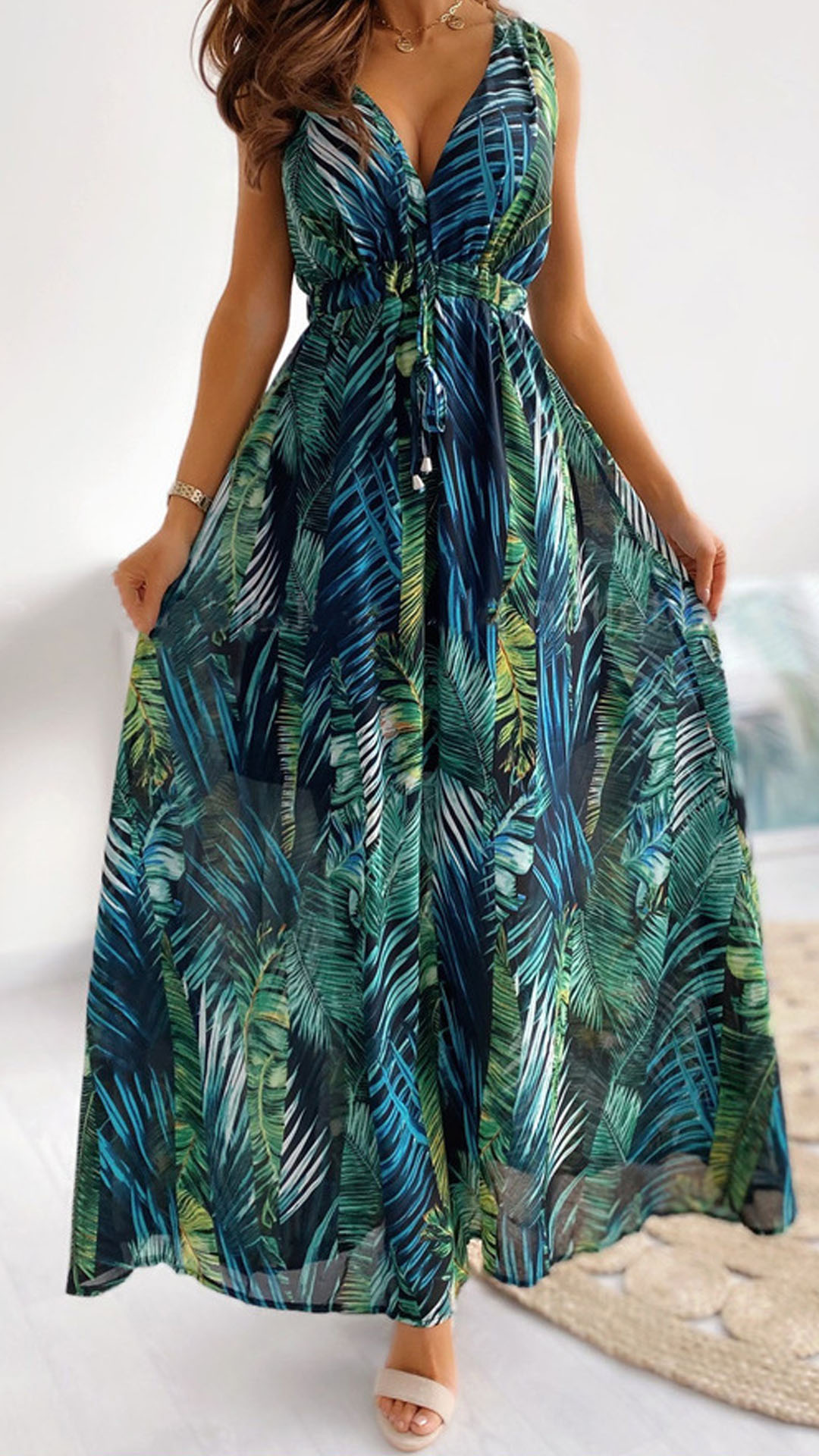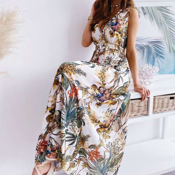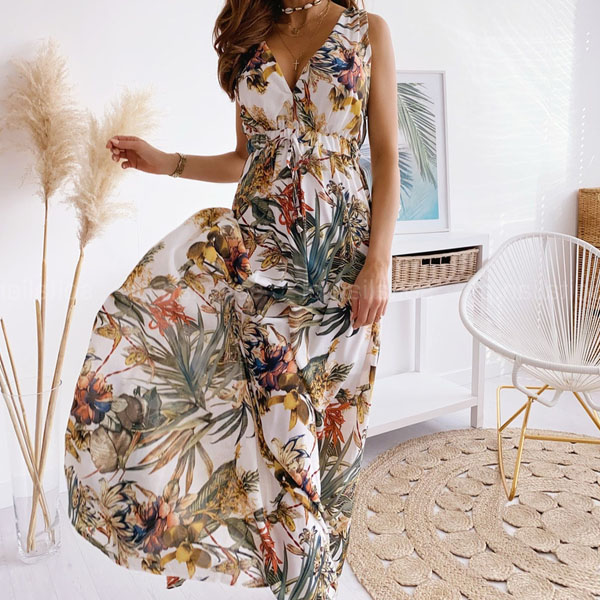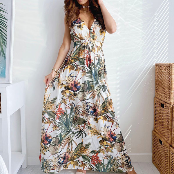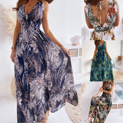 Your style cannot be outmatched when you are wearing this stunning dress. Designed with chic and eye-catching printed details,with sleeveless,high waist and maxi length,this dress knows how to showcase your slender figure. Meanwhile,the backless and v-neck design can offer you a more alluring look. It is a good choice for your summer events.
