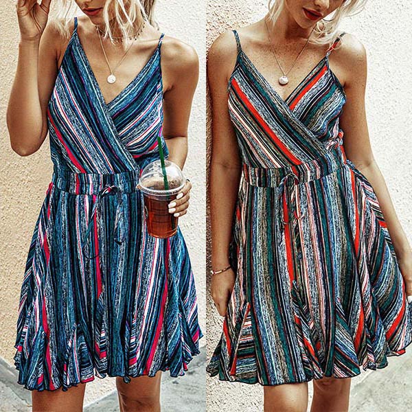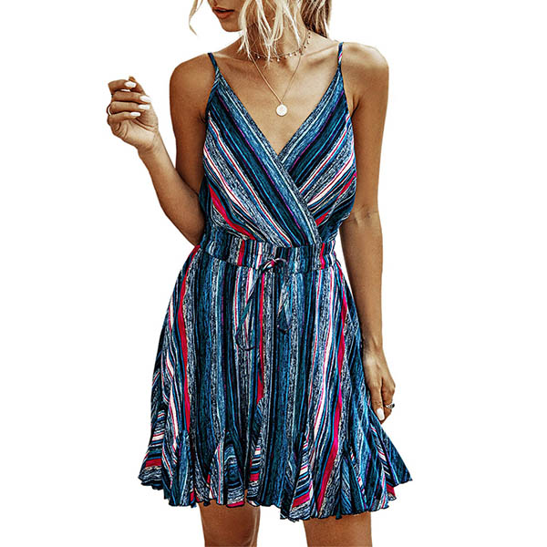 Sexy Backless V-neck High Waist Striped Sling Dress