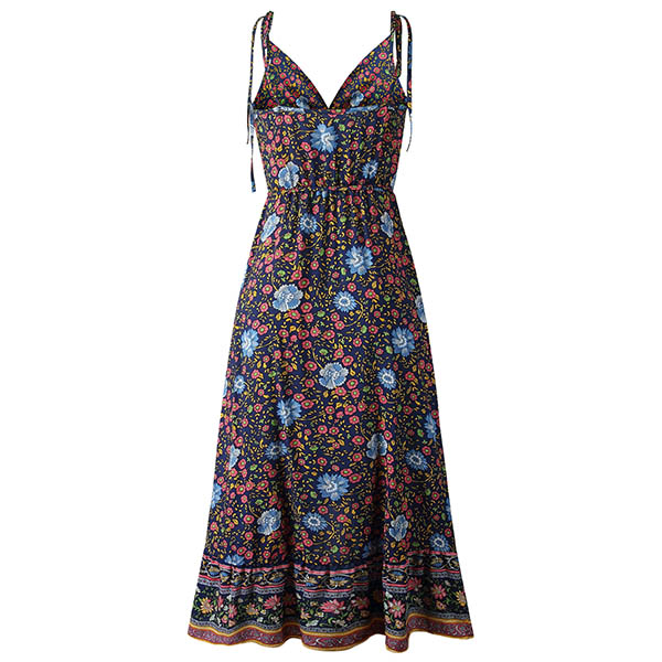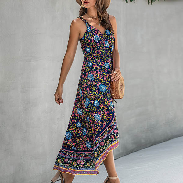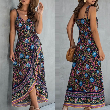 Embrace the sunny summer days with a beautiful printed dress such as this piece! Its vibrant floral print details make this piece look so eye-catching. Sling style,with backless,v-neck and an irregular hem,this dress can make you look effortless charming and beautiful!