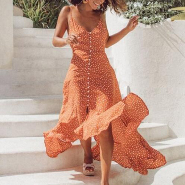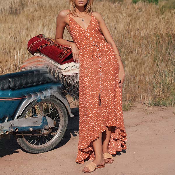 Outfitted with the features of sexy and charming,this dress is the key for an effortless sexy and charming look. Features chic printed details,with backless,v-neck and an irregular hem,this sling dress is perfect fit for the summer days.
