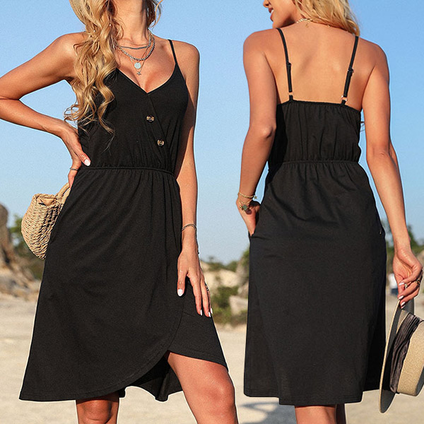 To greet the sun-soaked summer days,you can just have a try this relaxed,dreamy dress. Sling style,with backless,v-neck and an irregular hem design,these details will offer you a more alluring look. Moreover,the waist strap design can better showcase your slender figure and waistline. So why not add this piece to your summer wardrobe ensemble?