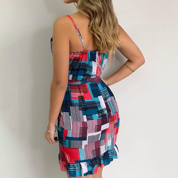 Your sexy and charming summer style can have a full display in this dress. Sling style,with backless,v-neck and an irregular ruffle hem design,sexy and flirty. The colorful printed details will make this piece look more eye-catching. So why not add it to your summer wardrobe ensemble?