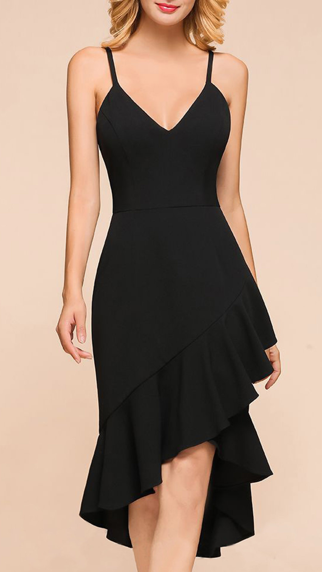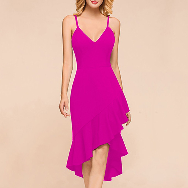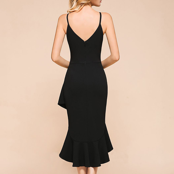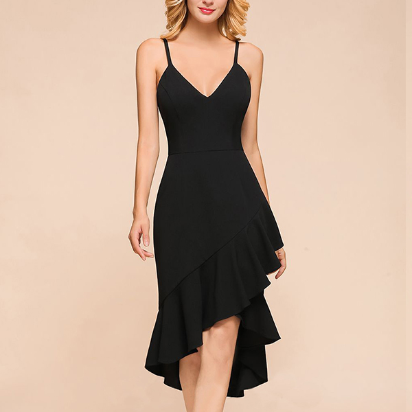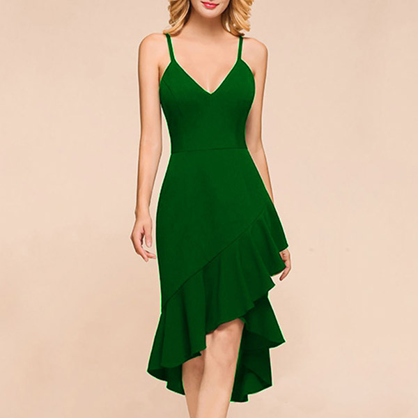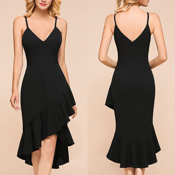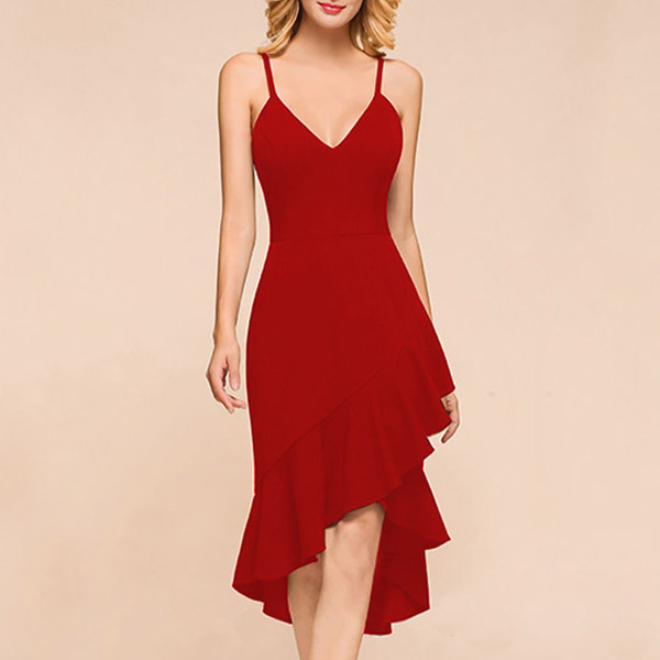 If you're in search for a dress which is perfect fit for the parties and gatherings,then look no further than this piece. Sling style,with backless,v-neck and an irregular ruffle hem design,this dress definitely can express your beauty and charm.