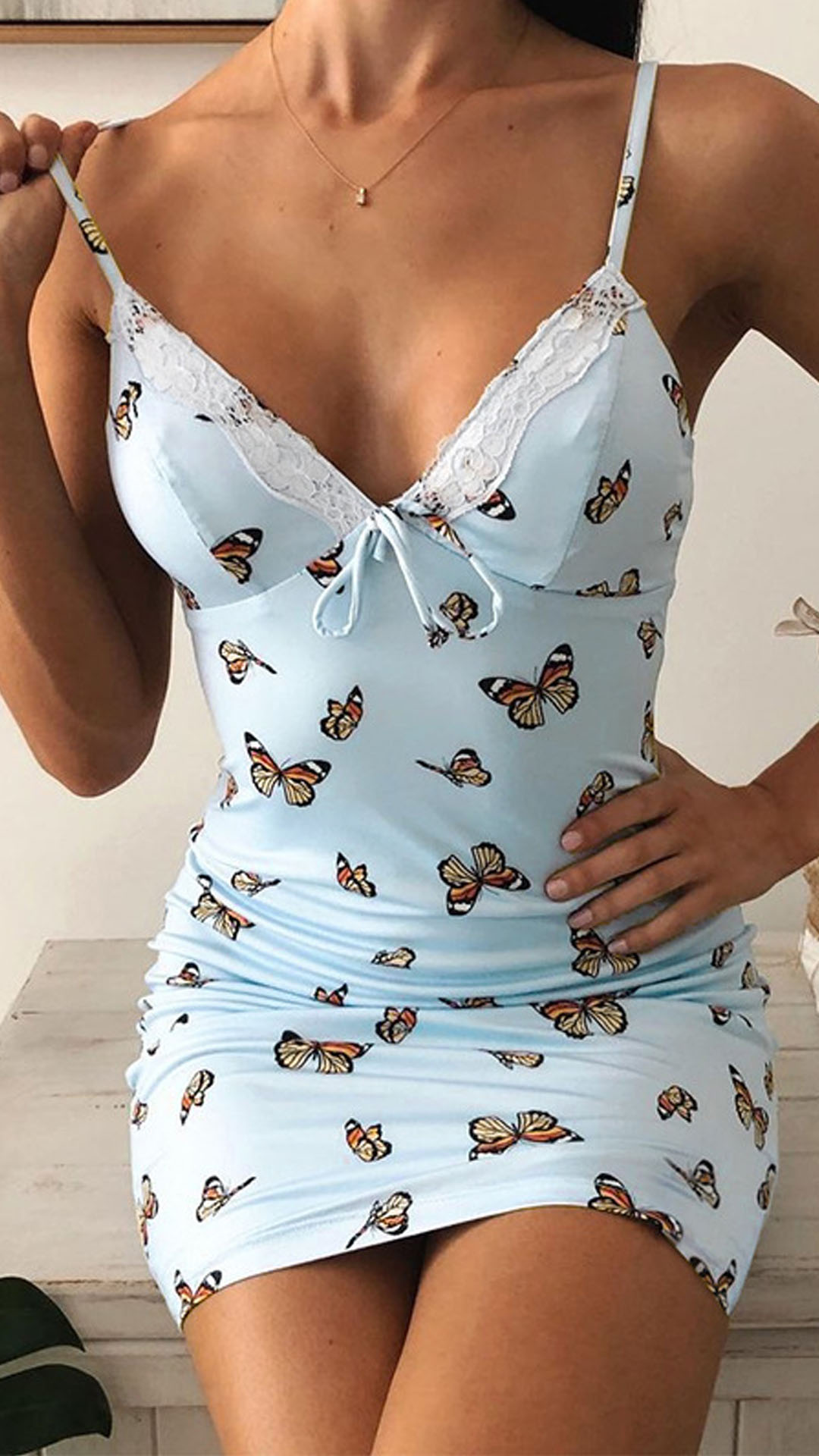 Sexy Backless V-neck Lace Spliced Butterfly Printed Slim Fit Sling Dress