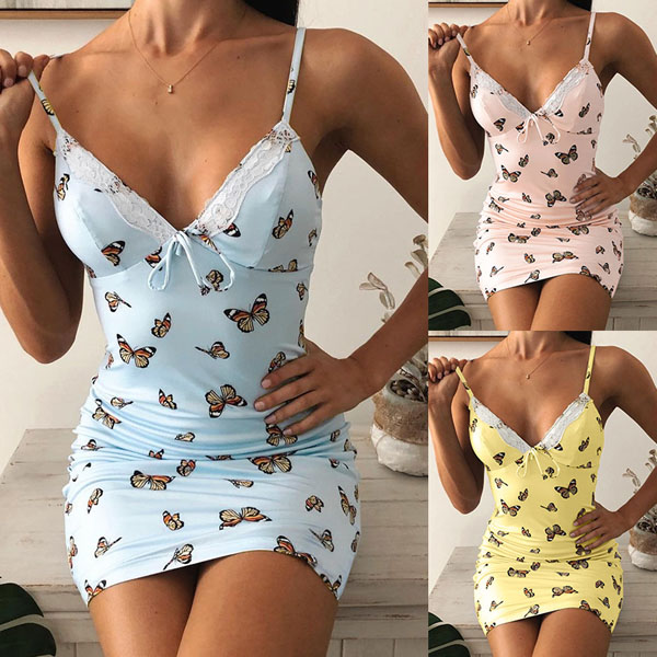 It is a good chance to exude your feminine side through this dress. Sling style,with backless,v-neck and lace spliced details,sexy and alluring,while the butterfly printed details will make this piece look more eye-catching. There is no doubt that you can easily win more eyes when you dress yourself up with this dress.