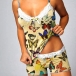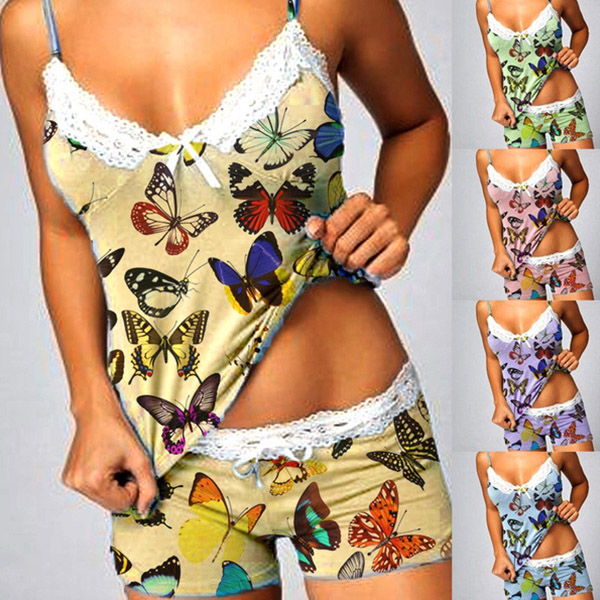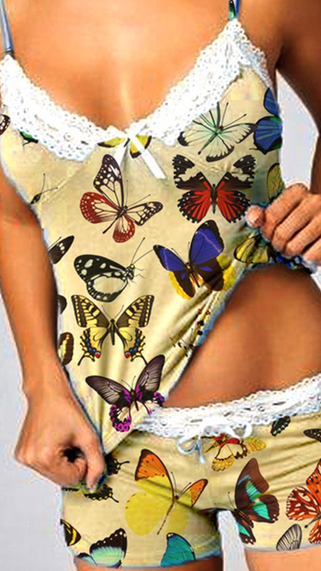 As for your sleeping time and home time,this nightwear set can easily strike your mind. The butterfly printed pattern design make it look so vivid and eye-catching. Including a backless v-neck sling top and a shorts,designed with lace details,this nightwear set not only can keep the comfy,but also can exude some feminine vibes.