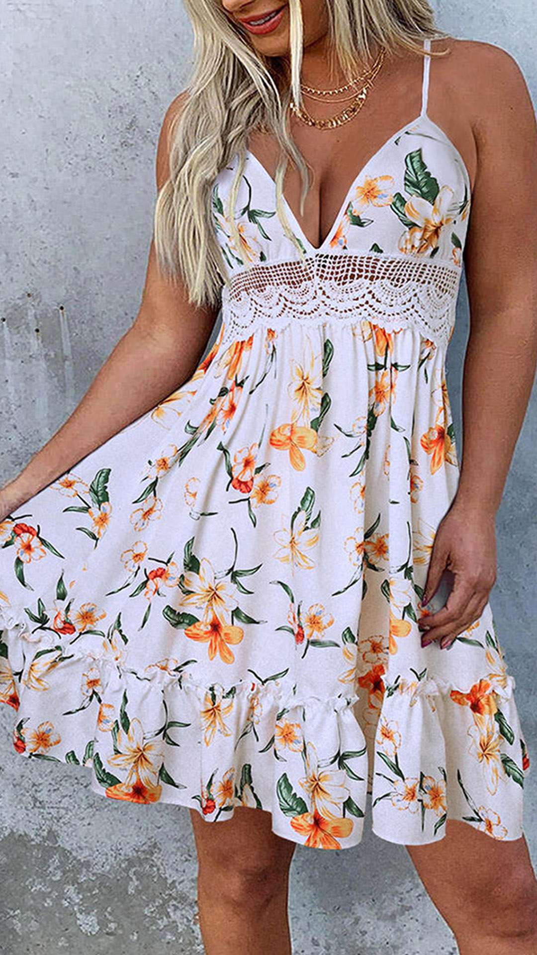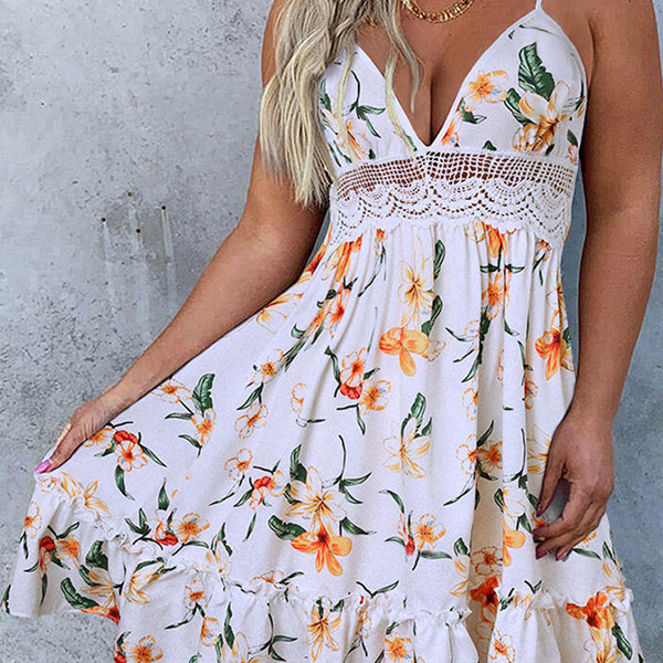Wow,how could you look so sexy and alluring in this dress? The backless,v-neck and hollow out lace spliced details make this piece full of flirty and feminine vibes. Sling style,with chic and eye-catching printed details,which can help you catch more eyes. For your sun-soaked summer days,this piece can be your wise choice.