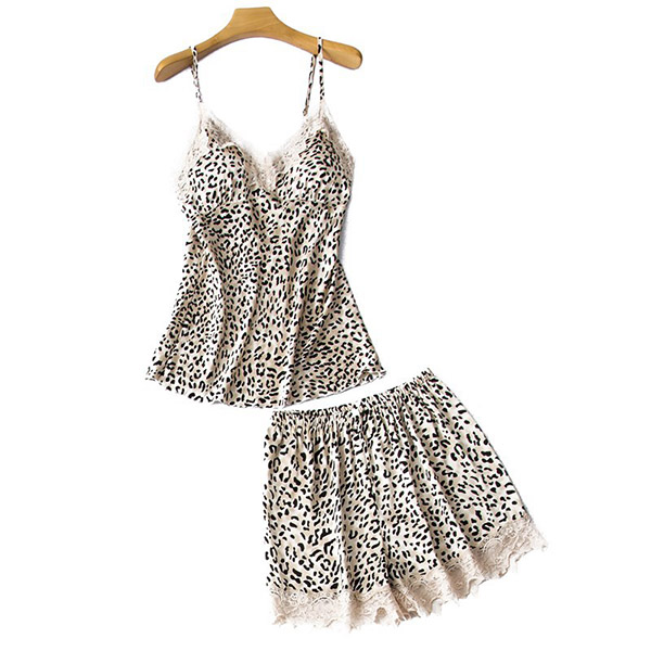 Sexy Backless V-neck Lace Spliced Leopard Printed Sling Top + Shorts Nightwear Set