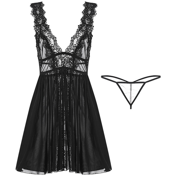 Sexy Backless V-neck Lace Spliced See-through Nightwear Dress + T-back Two-piece Set