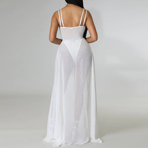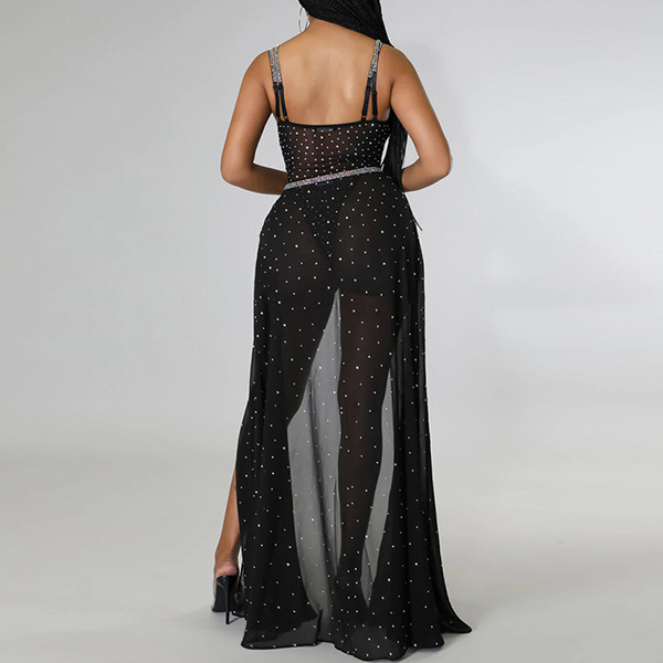 V-neck without back and a long high-waisted skirt with split hem, this number can