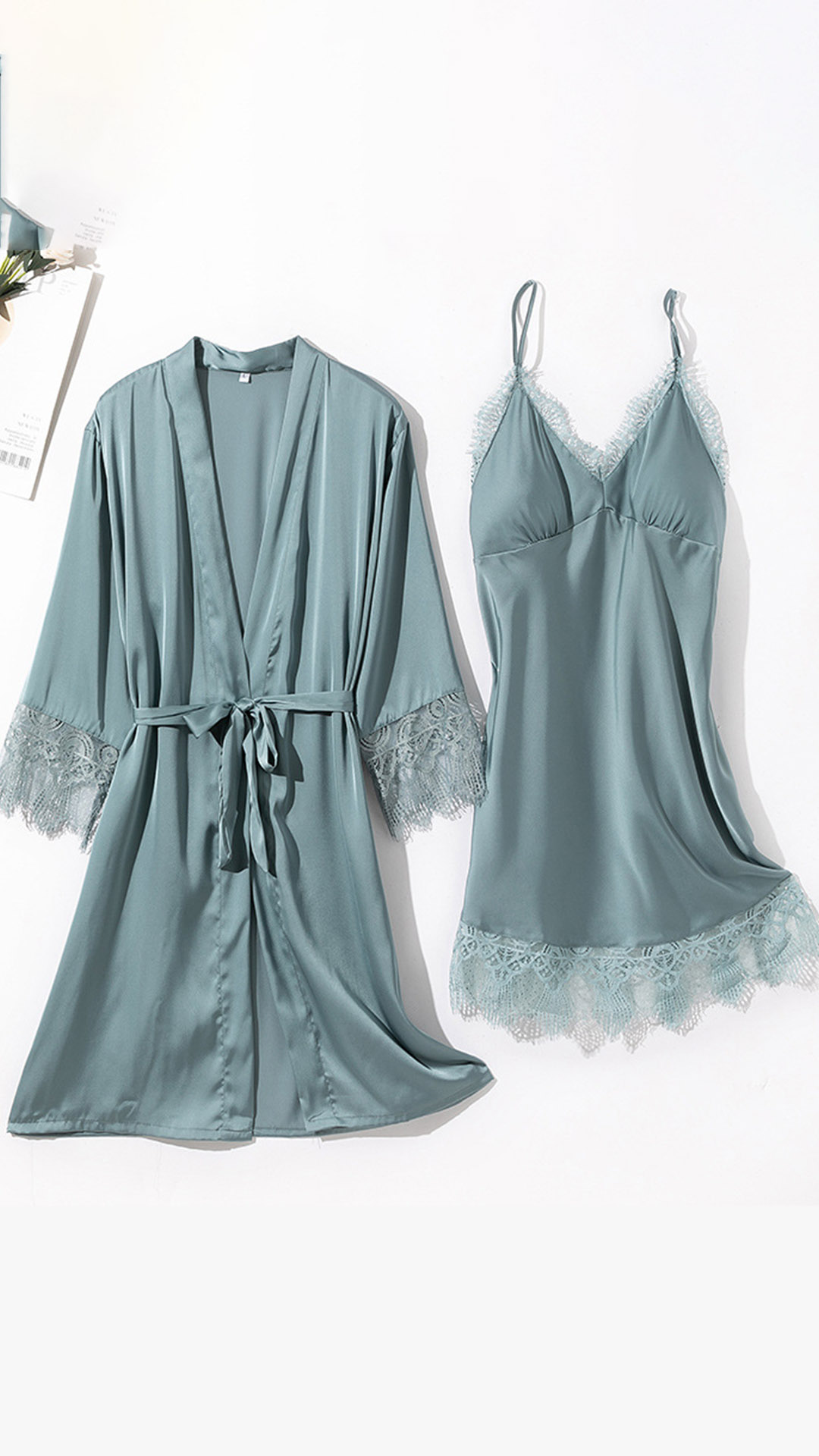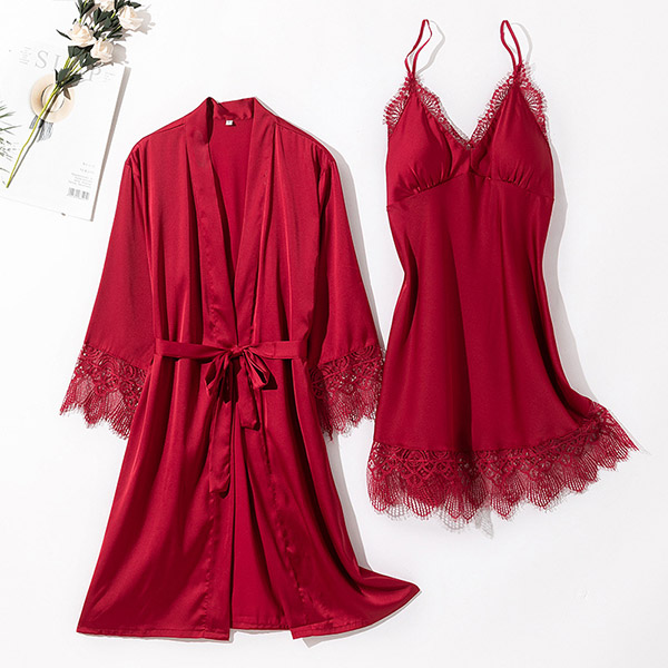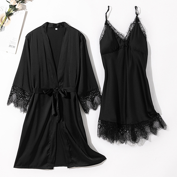 Sexy Backless V-neck Lace Spliced Sling Nightwear Dress + Robe Two-piece Set