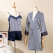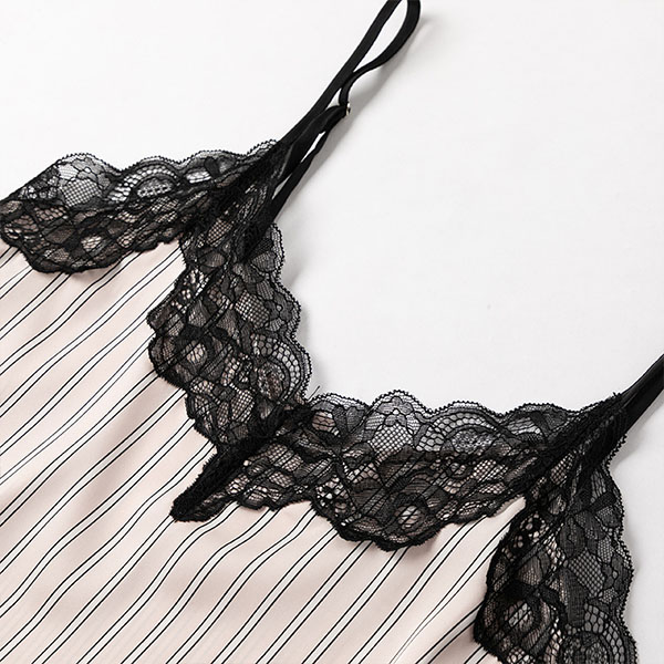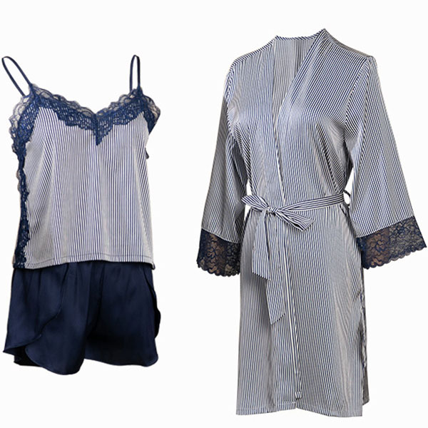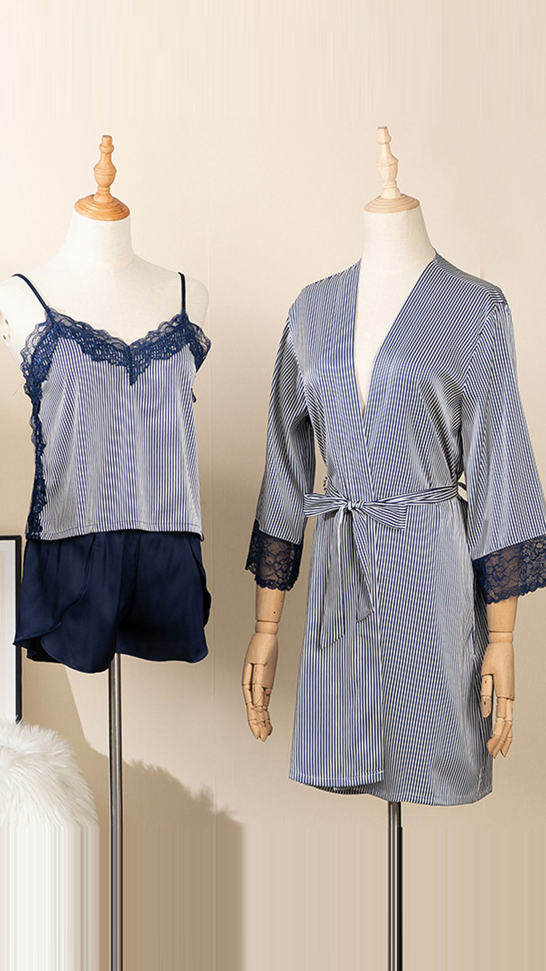 Sexy Backless V-neck Lace Spliced Sling Stripe Top + Shorts + Robe Nightwear Three-piece Set