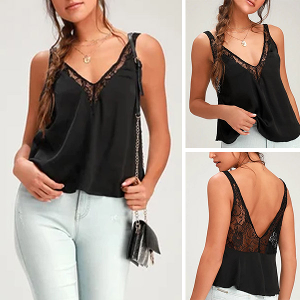 For these hot summer days,this sling top is a good way to expose your charming skin as well as your flirty side. Comes with a flattering black tone,the backless,v-neck and lace spliced design make this piece look so sexy and alluring. Try to match with a shorts to start your wonderful day!